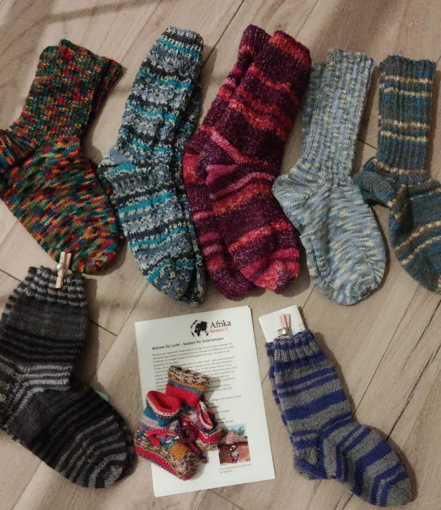 Afrika Herzen e.V. unterstützt diese Hilfsaktion mit dem Verkauf von selbstgestrickten Wollsocken. Diese bieten wir für 13 Euro pro Paar an (meliert und uni). Die Socken können bestellt oder in Hilden direkt abgeholt werden.