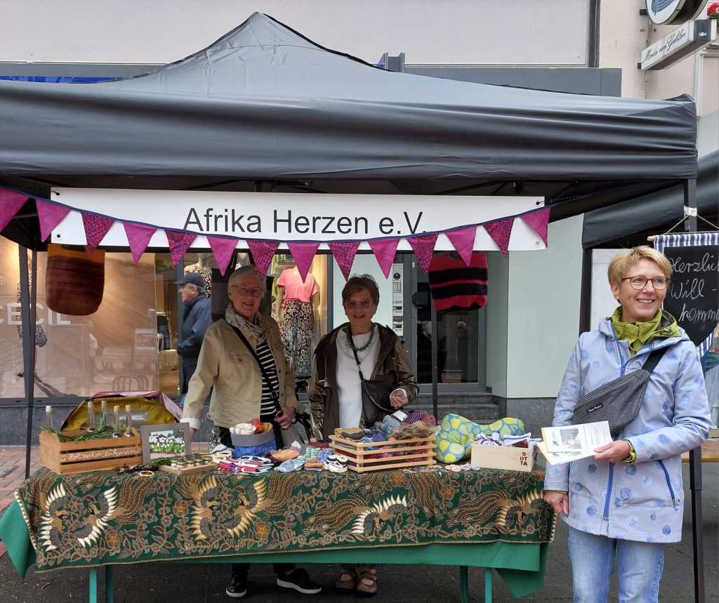 Am 25. Mai war Afrika Herzen e.V. zum ersten Mal bei der Ehrenamtsbörse in Hilden dabei. In der belebten Innenstadt präsentierten wir unseren Stand. Neben Informationsbroschüren über unsere Projekte und Ziele konnten die Besucher*innen auch liebevoll selbstgemacht Kleinigkeiten erwerben, die von unseren engagierten Mitgliedern mit Herz und Hand angefertigt wurden. Die Resonanz war toll – viele Interessierte hielten bei uns an, informierten sich und zeigten großes Interesse an unserer Arbeit. Ein herzliches Dankeschön geht an unsere engagierten Mitglieder, die den Stand betreut und den Tag zu einem besonderen Erlebnis gemacht haben! Wir freuen uns schon jetzt auf das nächste Mal!